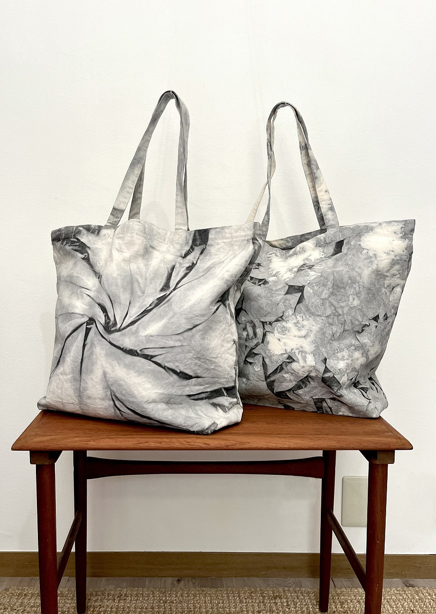 墨染めは、深みがあるグレー。光との反応を利用した墨染めならではの方法で、工夫次第でいろいろな柄を表現する事ができます。 天然繊維(綿、麻、ウール、レーヨン、シルク)の布ならお家でも簡単に染色できます。 今回の教室では絞り染めの簡単な技法で製作します。 自分だけのオリジナルバッグをつくろう! 作品サイズ:縦約40cm×横約33cm×マチ約15cm ※持ち手の長さ約58cm *会場は東館4Fとなります。