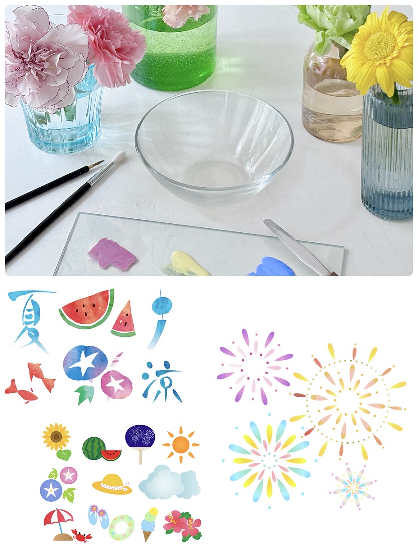 色の3原色を学びながら、ガラスボウルに好きな夏のモチー フを筆で描いていきます。アイス、ヨーグルト、サラダ、フルーツ入れ等にピッタリ! 作品サイズ:直径約11.8p×高さ約4.8p ※お渡しは焼成後の8月下旬予定 *会場は東館4Fとなります。