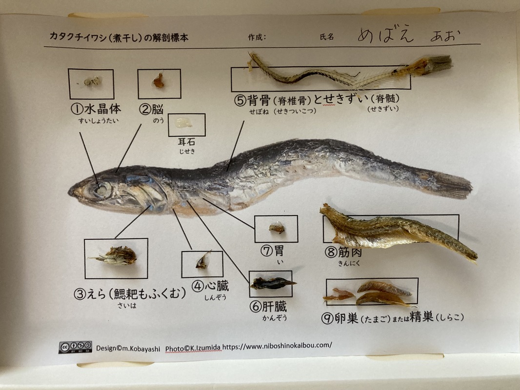 きれいな特大サイズの煮干しは、特別な道具を使うことなく、手でも簡単に分解できる魅力的な教材なのだそうです。