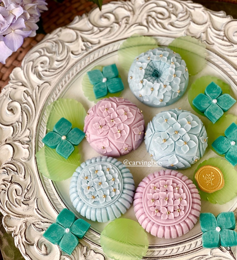 彫る素材は主に野菜・果物・石鹸などですが、今回はカービング専用ナイフ1本を使って、はじめての方でも簡単にできる“お花のモチーフ”を石鹸に彫り、香水瓶立てに仕上げます。