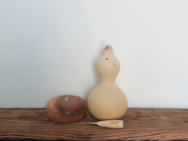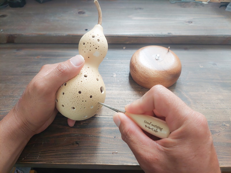 穴あけ: 画ビョウや目打ち、ドリルなどを使って、ひょうたんに穴をあけます。