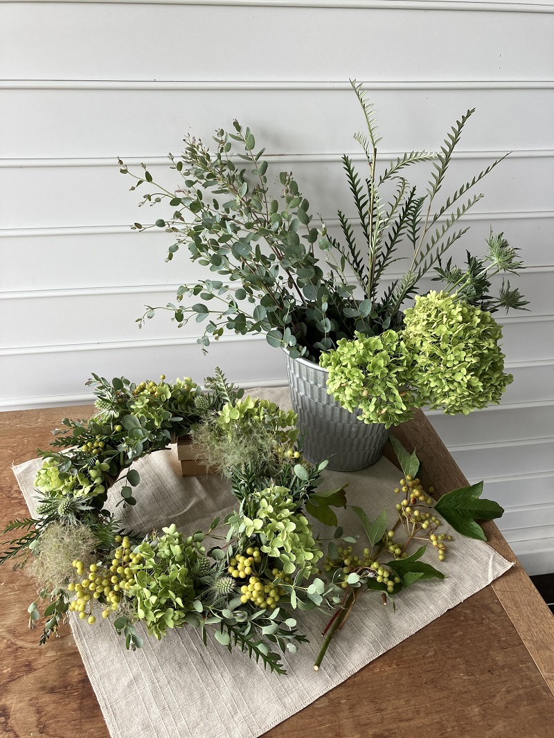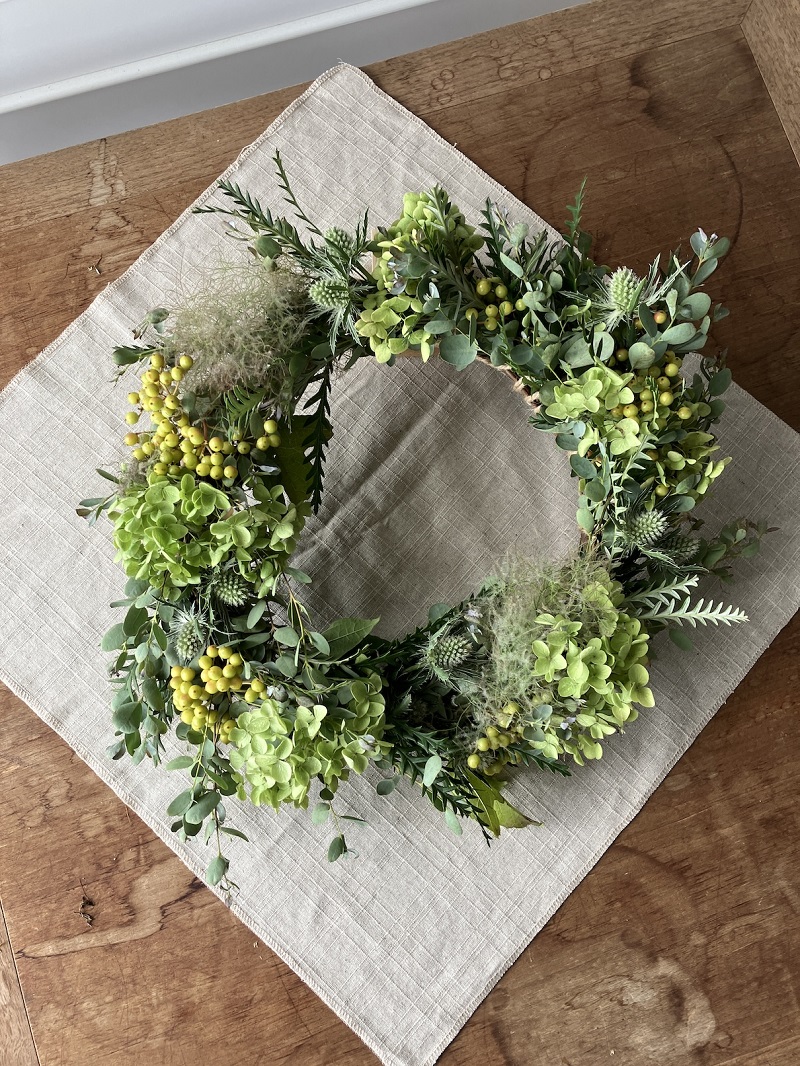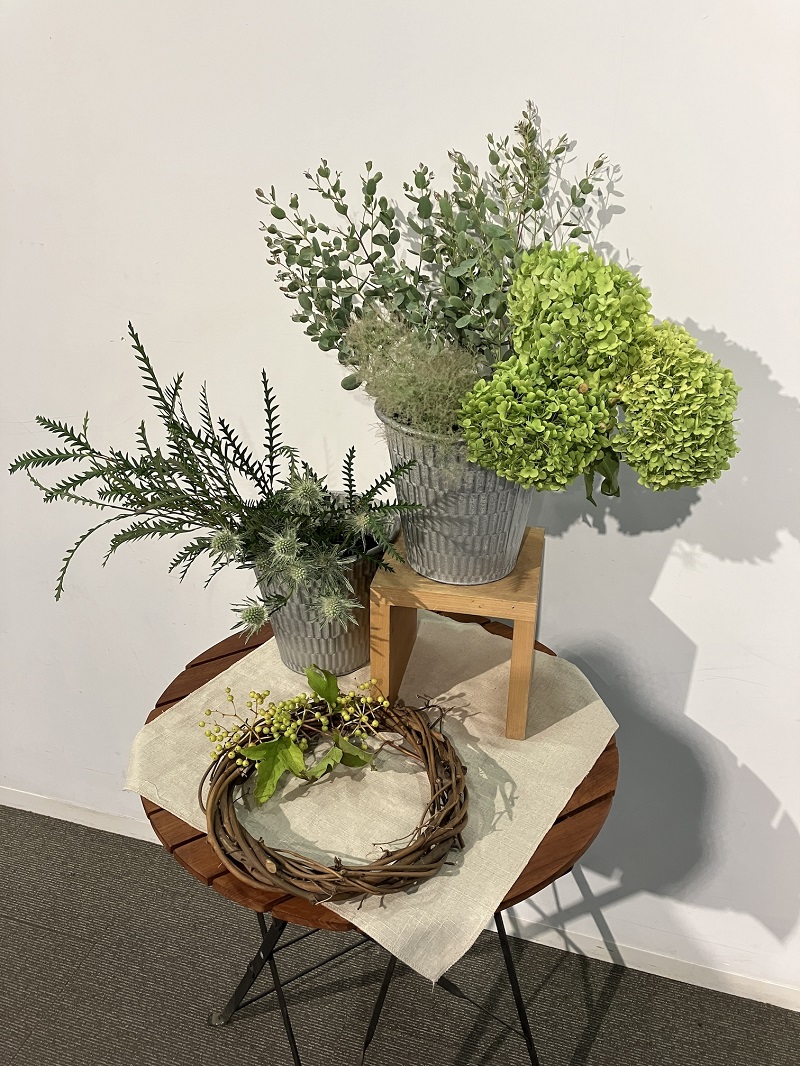 今回は、S・Cで収穫されたアナベルをセミドライにして、スモークツリー、グレビレア、ユーカリ、エリンジウム、サンキライなどを合わせて夏のリースを作ります。