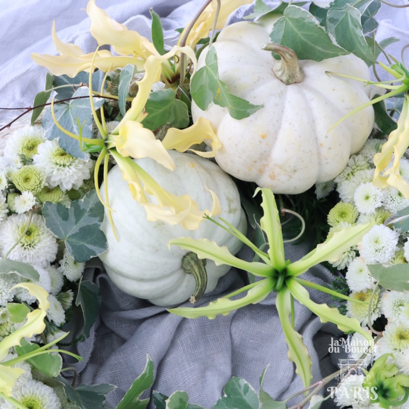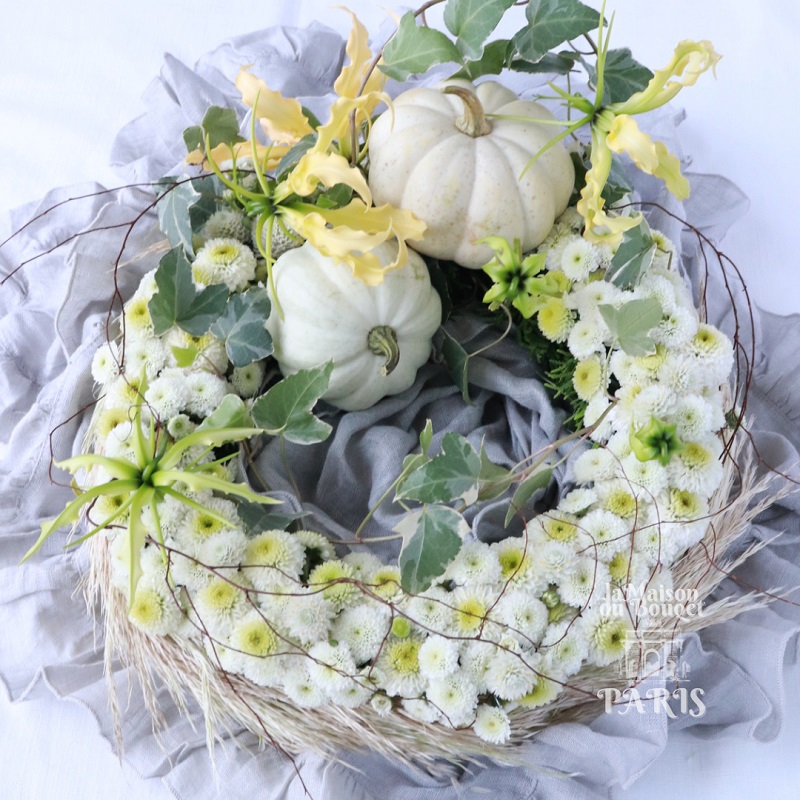 白色のカボチャに生花を組み合わせて、大人っぽくも洗練の美しいリースができあがります。