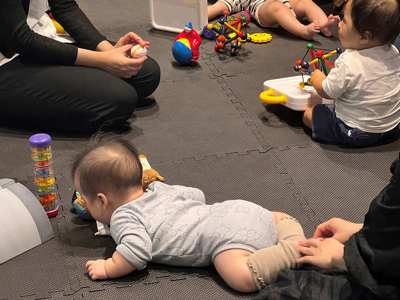「赤ちゃんとPLAY TIME」は、あそび道具のプロであるボーネルンドが開発したオリジナルプログラムです。同じ月齢の赤ちゃんとファミリーが集まって、月齢に応じたあそび道具を使って一緒に遊びながら情報交換をしたり、子どもの発達と遊びについてインストラクターがお話ししたりしながら楽しい時間を過ごす会です。
