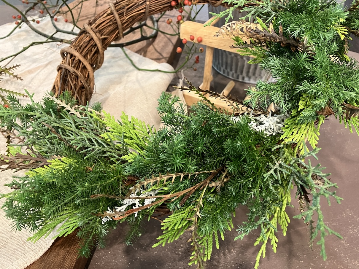 今回のクリスマスリースは、定番のモミやコニファーをベースに、アイバンホー、サンキライ、バーゼリア、ブルーアイス、ブルーバード、ヒバなどアクセントになる花材を足してリースに仕上げます。