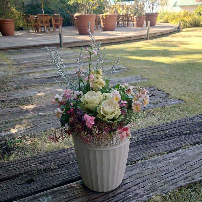 玉川高島屋S・C本館屋上階。エレベーターを降りた途端、目に飛び込んでくるのは、花、花、花、 色とりどりの草花、青々としたグリーンetc. そこを運営しているのは「プロトリーフ」。 先ごろまでガーデンアイランドにあった店舗が本館に移動して、屋上庭園の入口を華やかに彩る植物の園を開設しています。 今回、その「プロトリーフ」が季節の草花を使った「寄せ植えワークショップ」を開いてくれることになりました。 当日予定している花材は、冬の寒さに強く春まで楽しめるビオラ、ハボタン、ストック、ネメシア、ハツユキカズラなど。鉢の大きさは、直径28cm、高さ26cm。高さ50cm程度の仕上がりになります。 クリスマス直前の12月23日。 冬の時期を華麗に彩る「寄せ植え」は、年末からお正月の気ぜわしい日々を優しく癒してくれる存在になりそうです。 育て方やメンテナンスが難しいものは避けて、初心者の方でも簡単でおしゃれにできる寄せ植えの作り方を教えてもらいますので、どなたでも安心してご参加いただけます。 花や植物に関する基礎知識や組み合わせ方、カラーコーディネートのコツなどもしっかりアドバイスしてもらいましょう。 切り花も素敵ですが、土物は生き物。 ご自分で作った寄せ植えを日々愛でる。 そんな生活の楽しみを、ここから始めてみてはいかがでしょうか?