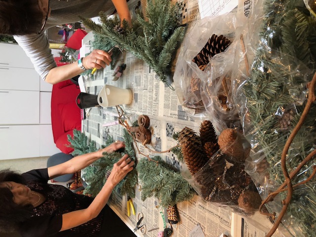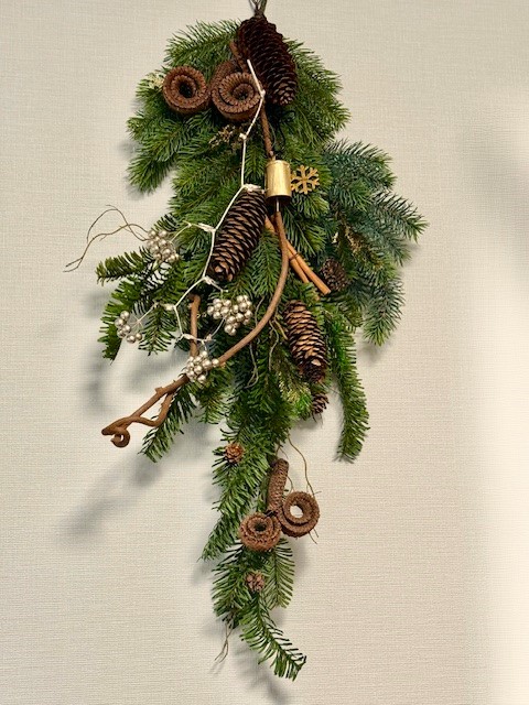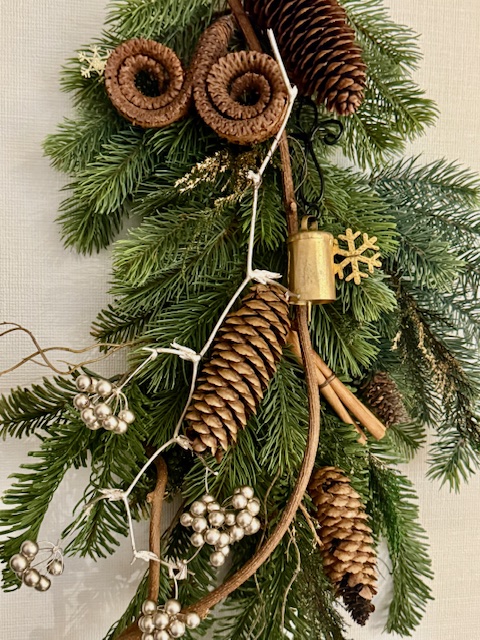 2種類のアーティフィシャルフラワーパインをベースに、松ぼっくり、山帰来の蔓、シナモンスティック、ツイッグバングルといった自然素材を組み合わせて仕上げます。