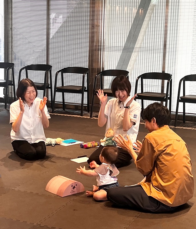 まず、それぞれ自己紹介をして手遊びでアイスブレイク。その後は月齢に応じたテーマで「あそびの時間」。最後にみなさんで質疑応答を交えた座談会という構成で行います。
